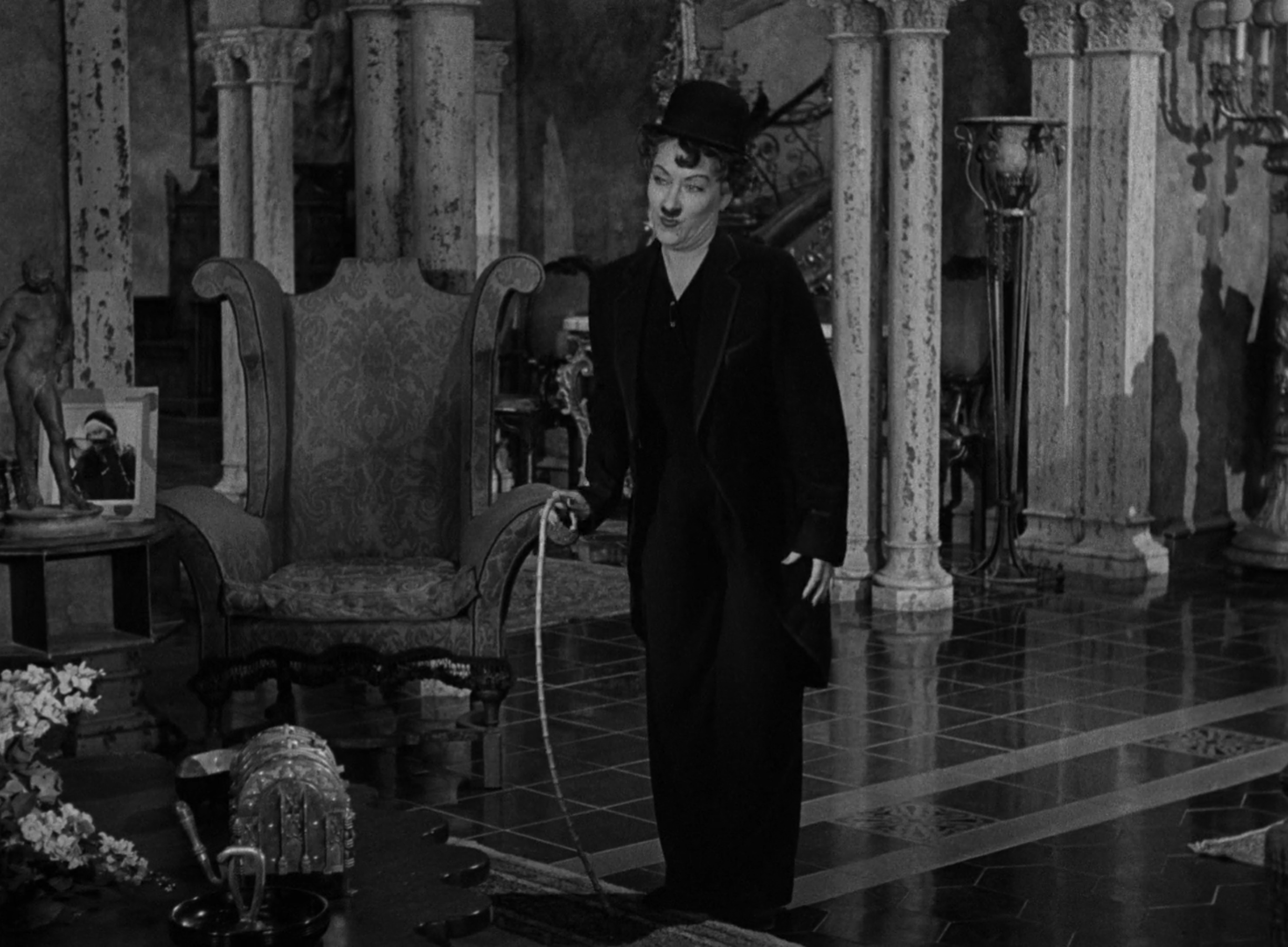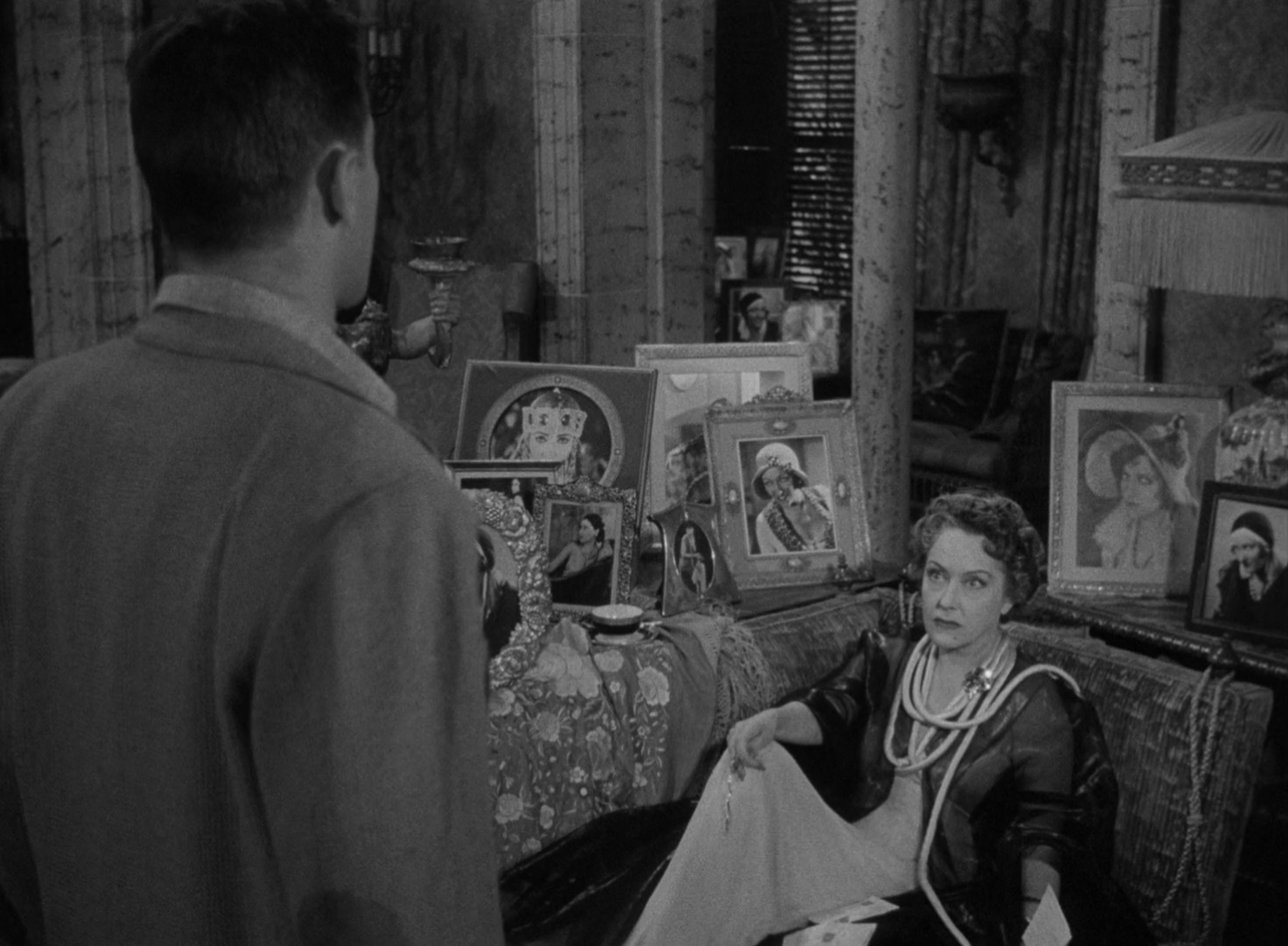 More than just being the name of a street in Hollywood, Sunset Boulevard is where stars fade away into the night, each one replaced the next morning by a younger, fresher luminary travelling along an identical trajectory. Norma Desmond is one such has-been who burned brightly in her youth, and yet in her old age (or at least, what Hollywood considers old) she has tumbled from the ranks of high society, her career opportunities drying up along with her youthful vitality. Though she is no longer a sex symbol, she tries to recapture that glamour in extravagant makeup and clothing, and frequently watches the old silent films she starred in, basking in her younger self’s charm and allure which has been lost over the years. No longer does she venture outside her colossal, Gothic mansion, cluttered with unsettling sculptures, archaic furniture, and framed photographs of her own likeness. Instead, she traps herself inside its dark, gloomy chambers, turning it into a tomb where unfulfilled dreams come to wither away and die.