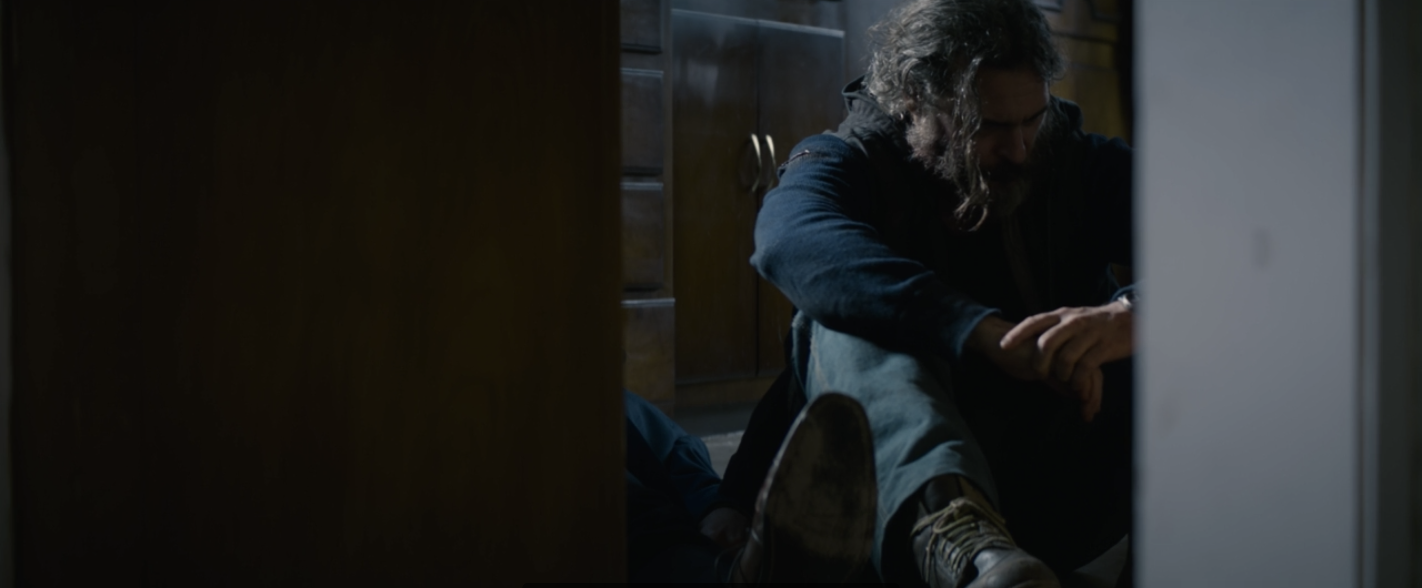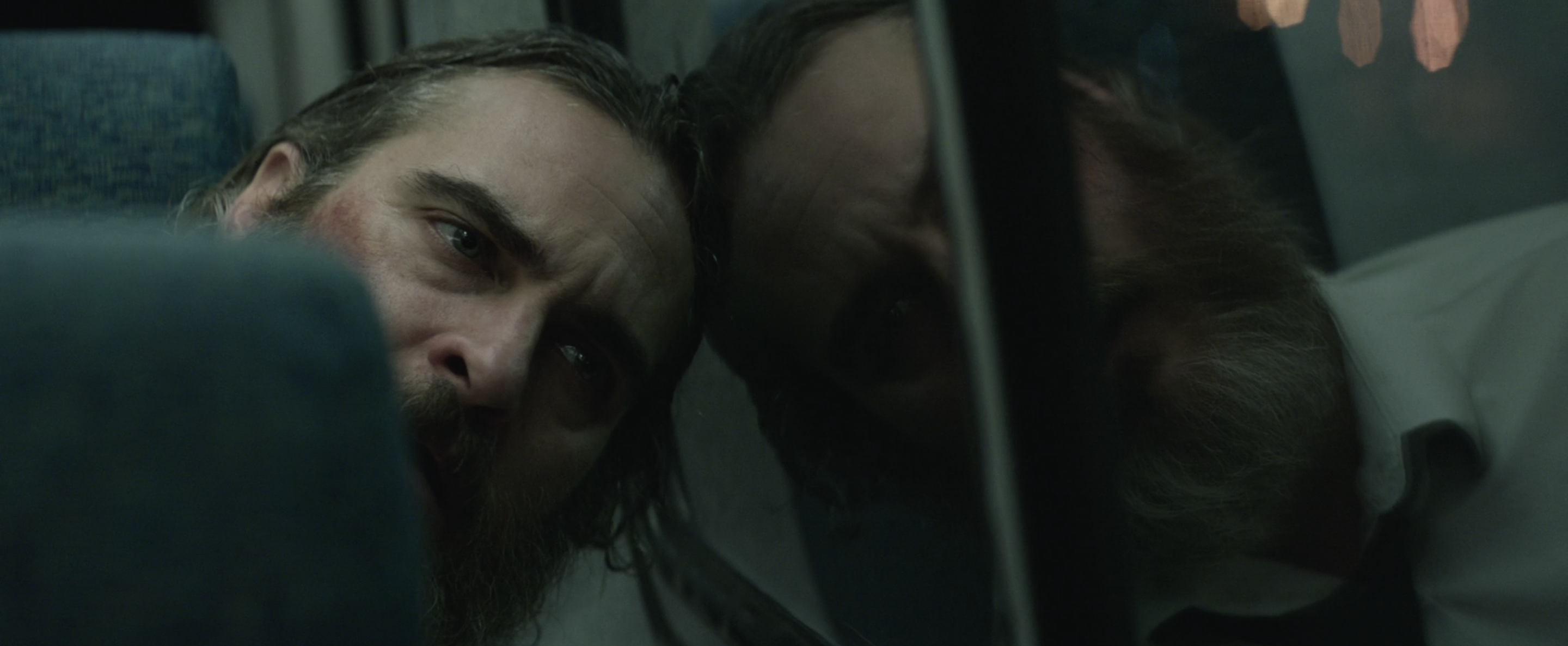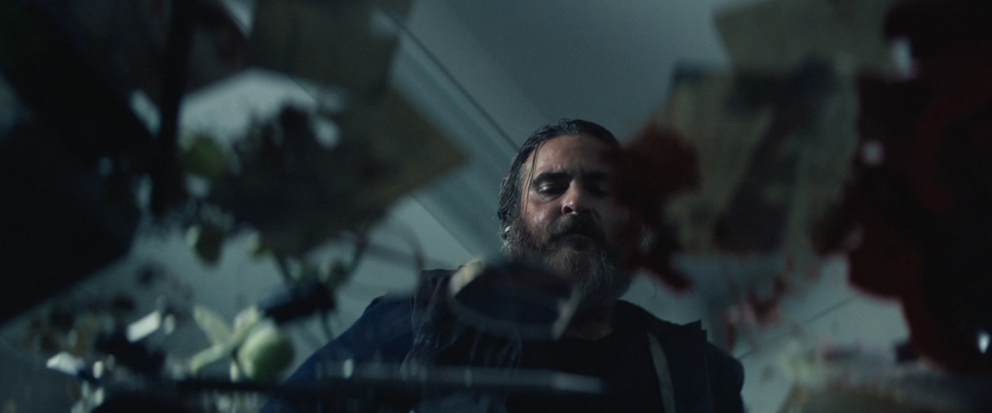 Inhabiting the vessel of trauma that Ramsay’s restless style whirls around is Joaquin Phoenix, whose aptitude for psychologically broken characters takes on entirely different dimensions here than we have seen before. His face is covered in shaggy, grey hair, serving the same purpose as his baggy clothing and low-profile cap in concealing the shape and identity of the man who lies beneath. Neither fat nor muscular seem like proper descriptions here, but he is heavy, laying his whole body into physical confrontations and choosing the blunt force of a hammer over other more practical weapons. Few of Joe’s opponents pose any real challenge to his raw physical power, and we come to accept this to the point that Ramsay eventually excludes his fights altogether as he infiltrates a mansion where Nina is being held captive. Instead, we simply cut between the black-and-white surveillance footage of his determined trudge through the halls and the quiet aftermath of each encounter along the way, his enemies silently lying in pools of their own blood.
