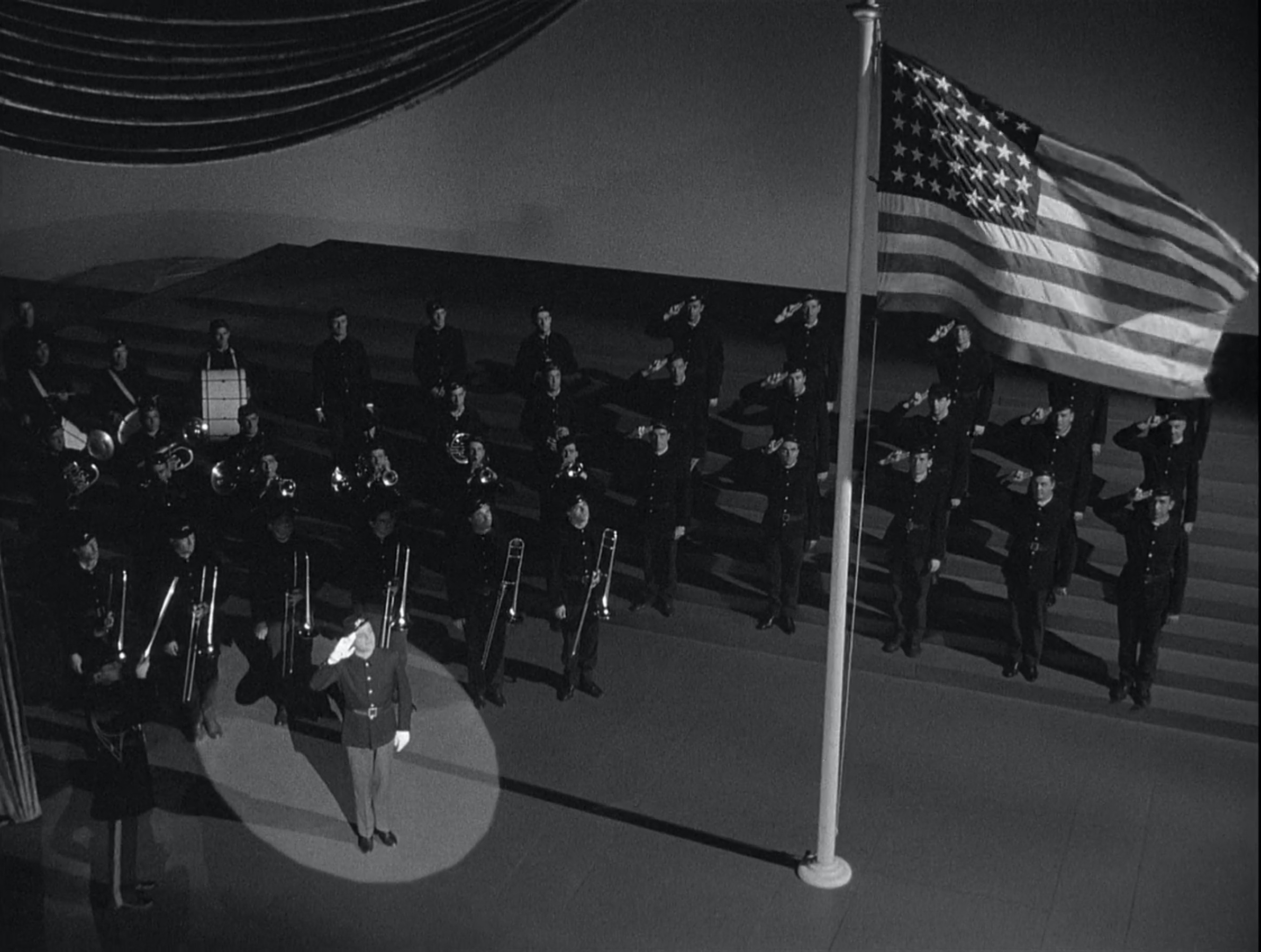 As a result of the collaboration between these two major Hollywood talents, there is a spry nimbleness both in front of and behind the camera, coming together in effervescent displays of patriotism and dazzling beauty. Curtiz’s transition into Cohan’s show-stopping number ‘Yankee Doodle Boy’ is just as energetic as the performer himself, lifting us from the conductor’s sheet music to the chorus onstage, clearing them out of the way to the sound of brilliant fanfare, before finally revealing Cagney standing proudly atop a podium. If it isn’t the camera movements revelling in the commotion of the theatre, then Curtiz is arranging his ensemble in tight formations and setting us back in wide shots to admire the military march of ‘You’re a Grand Old Flag’, or the unified raising of arms up to the Lincoln Memorial in ‘The Battle Hymn of the Republic’.