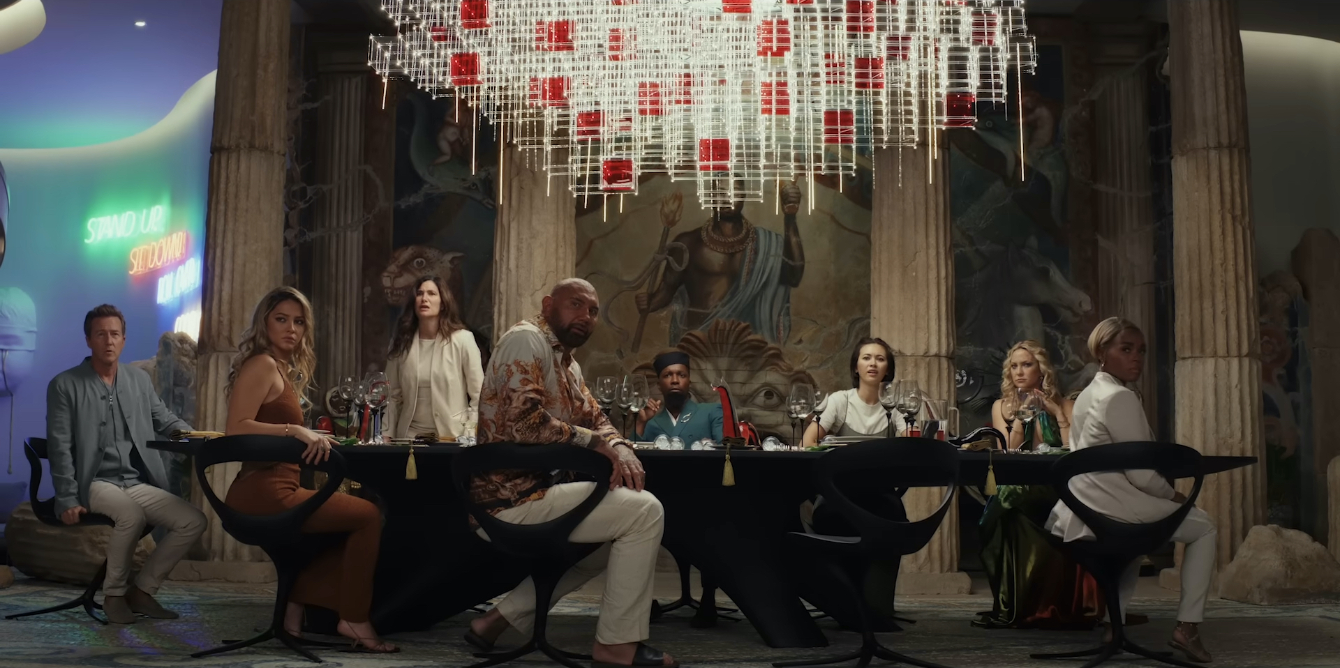 Johnson is in absolutely no rush to play out the inevitable murder that Blanc sets out to investigate either, instead thoroughly setting the table with an intricate web of character dynamics, a huge amount of foreshadowing, and a meta-awareness of genre conventions reminiscent of the previous film’s central puzzle. Instead of a mystery novelist’s death inside a giant country mansion though, the setting of a murder mystery dinner keep us on edge before any crimes are even committed, letting us reflexively pick up on clues that may or may not point to some grand conspiracy.