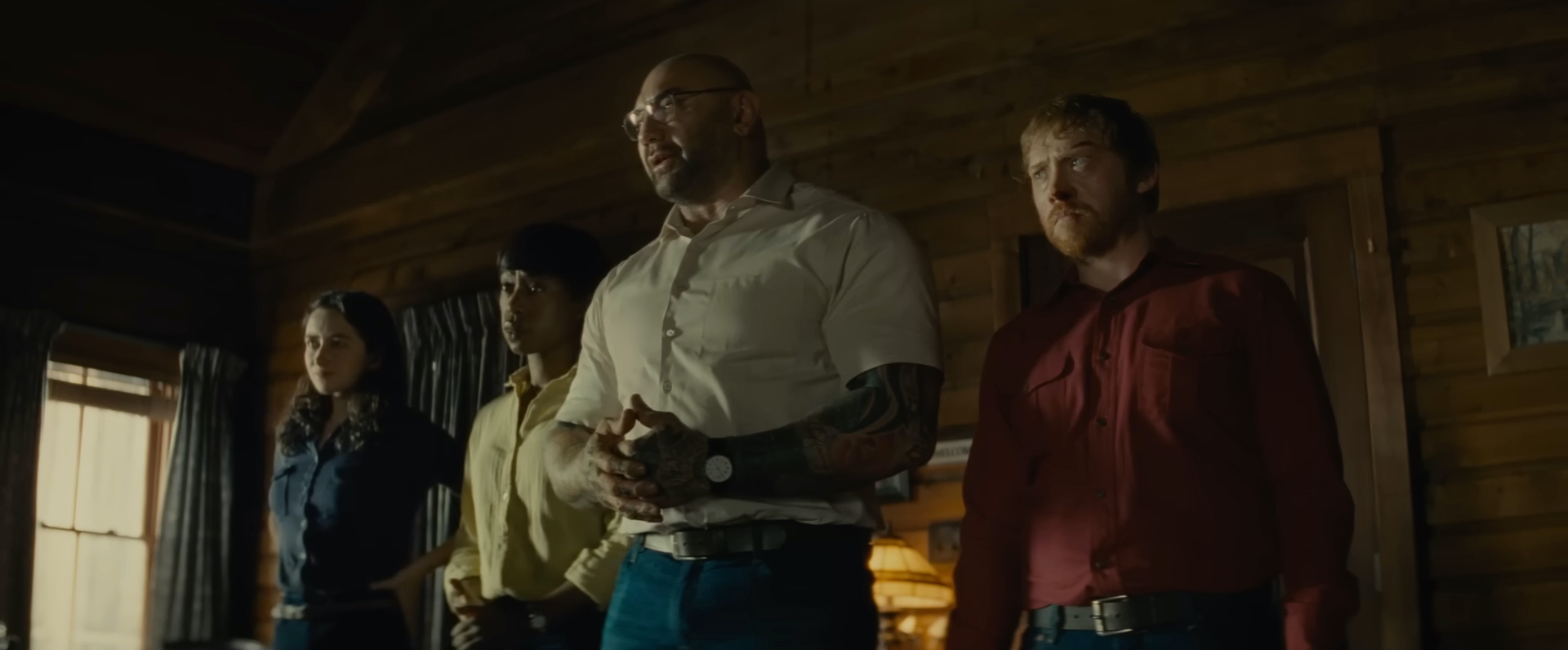 Within Shyamalan’s tight framing and low angles, Bautista’s large stature often fills entire shots, bringing an imposing physical presence to his monologues that wistfully consider their destiny and onus as a collective group. In shallow focus close-ups too, he and his co-stars talk right down the lens of the camera, and Shyamalan relishes the opportunity here to push his style in uneasy directions as his canted angles start tilting their faces off-centre. The consistency of this aesthetic is admirable, turning what could have been flatly staged conversations into riveting confrontations, evidently inspired by Jonathan Demme’s intimate direction of the anxiety-inducing meeting between Clarice and Hannibal Lecter in The Silence of the Lambs.