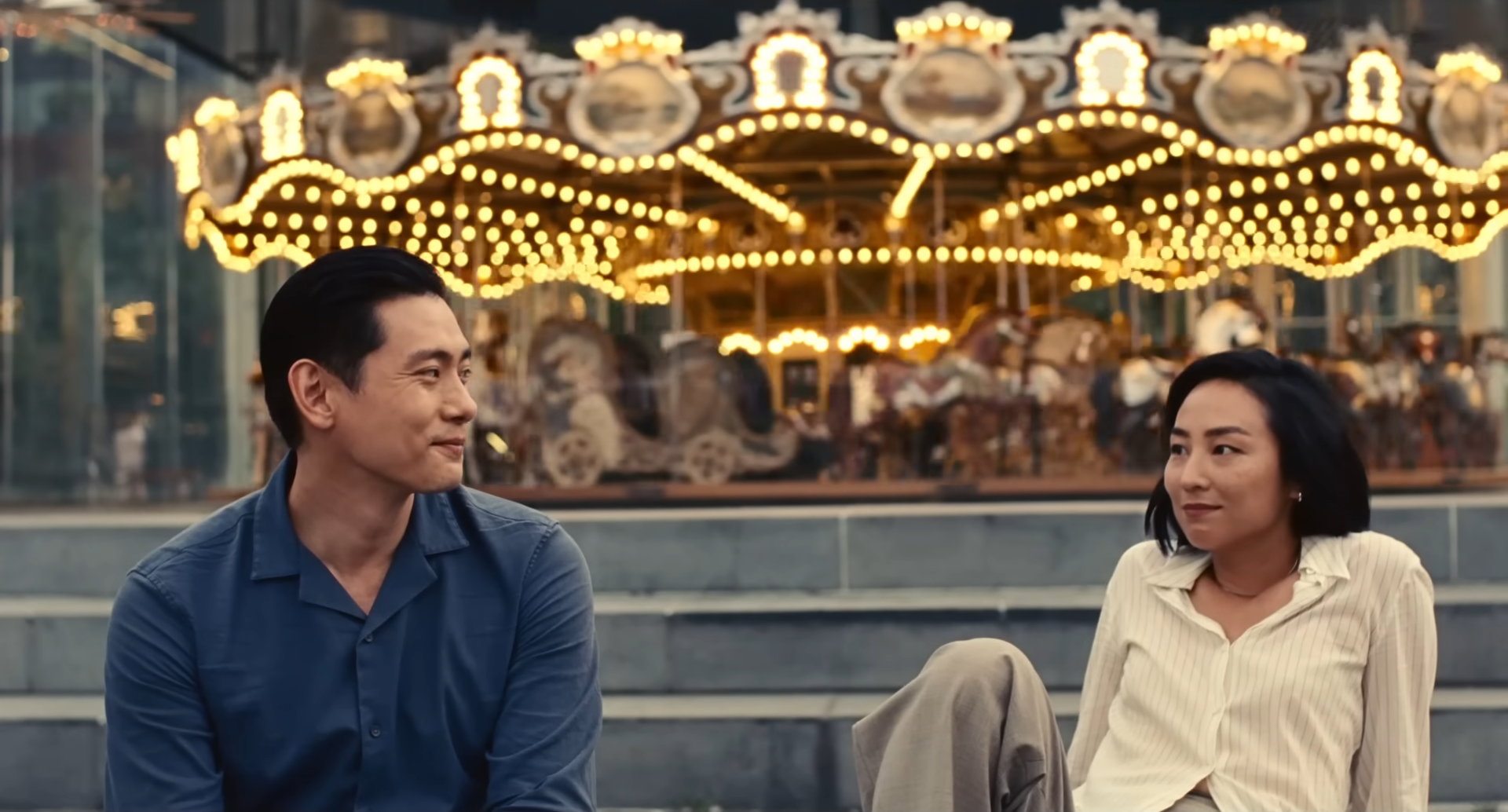 Subtly crucial to the melancholic serenity of Nora and Hae Sun’s conversations too are those organic silences that emerge between them, revealing a mutual comfort in each other’s presence rather than awkward uncertainty. Through Greta Lee and Teo Yoo’s small glances and understanding smiles, we see all the poignant complexities of their semi-romantic love, while life continues to move around them in spinning carousels and rocking boats.