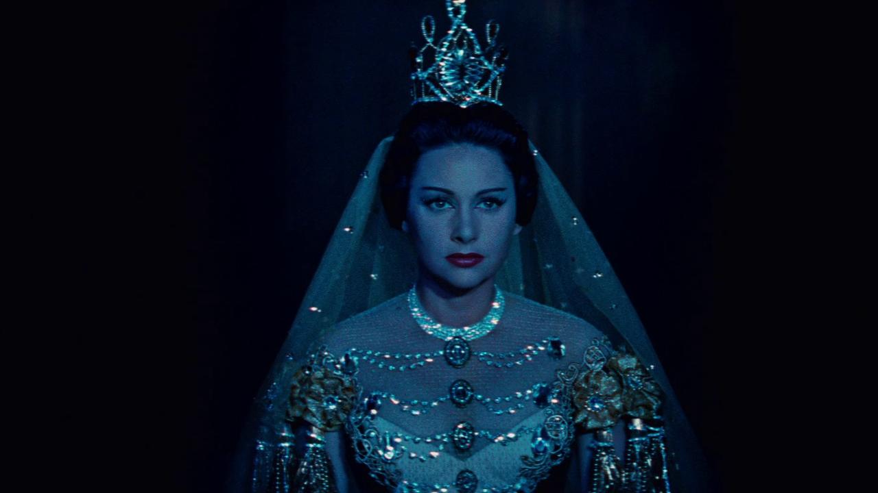 Whether actress Martine Carol is wandering through a rundown children’s dormitory of grey hammocks or draped in the finest royal garb, there is an air of delicate eminence to her, even as lush period décor and fluctuating aspect ratios press inwards like stage curtains. She is the luminous centre of each setting, asserting a screen presence that demonstrates why so many considered her France’s response to Marilyn Monroe, despite Lola’s dark wigs covering up Carol’s usual blonde hair. Cloaked in sparkling jewels and surrounded with extravagant historical décor, it isn’t hard either to see where the budget went for what was the most expensive European film of its time. Mirrors catch her reflection as she contemplates an uncertain future, transparent gauze drapes conceal her final goodbye to Ludwig, and the golden embellishments of Bavarian palaces frame her as another treasure added to the royal collection, lifting her to even greater heights as an inhuman object of imperial perfection.