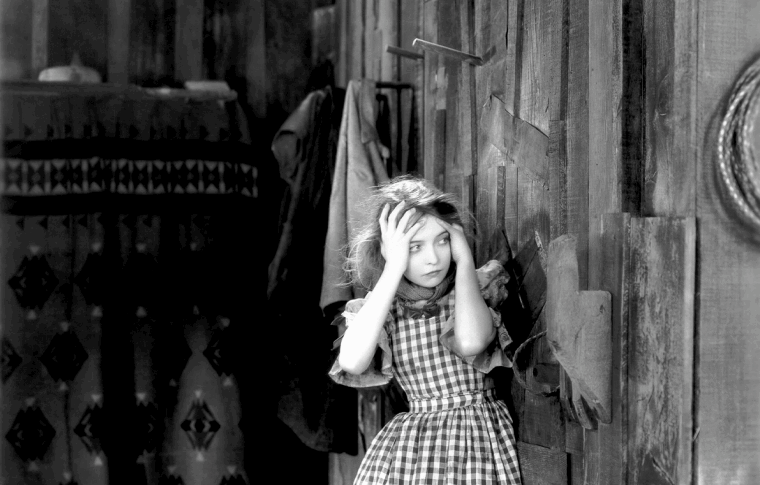 Gish too seems possessed by this invisible force, her eyes stretching wide with terror and drooping into a hypnotic trance as she rhythmically sways with the hanging lanterns and camera. Kitchen bowls rock on shelves as if enchanted by spirits, and soon even the glass windows give in to the piercing wind, knocking over an oil lamp and setting a blanket on fire. In the sky above, that great white horse continues to whip up violent flurries, but a pounding at the door heralds an even greater peril – an opportunistic Wirt, taking advantage of Letty’s vulnerability to force himself on her.