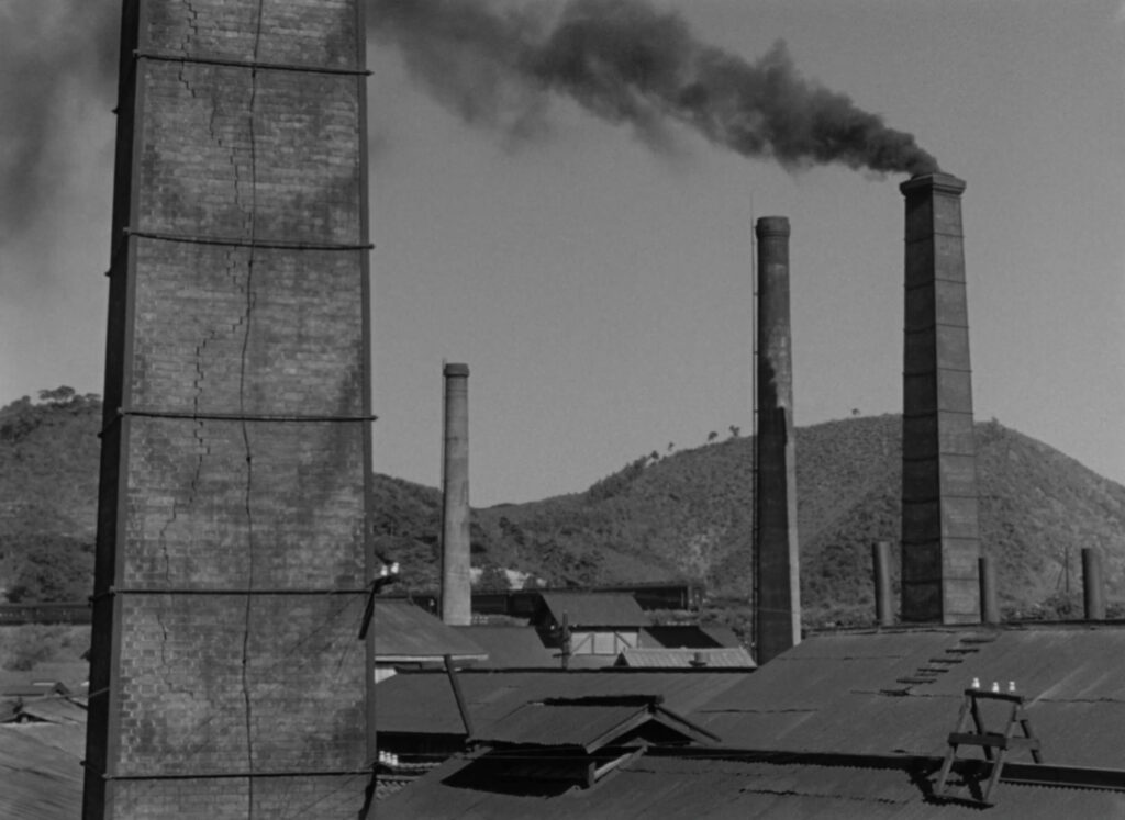 Delicate, formal mirroring of Shōji and Masako’s upright figures through the smokestacks in the following pillow shots, patiently drifting time onward.