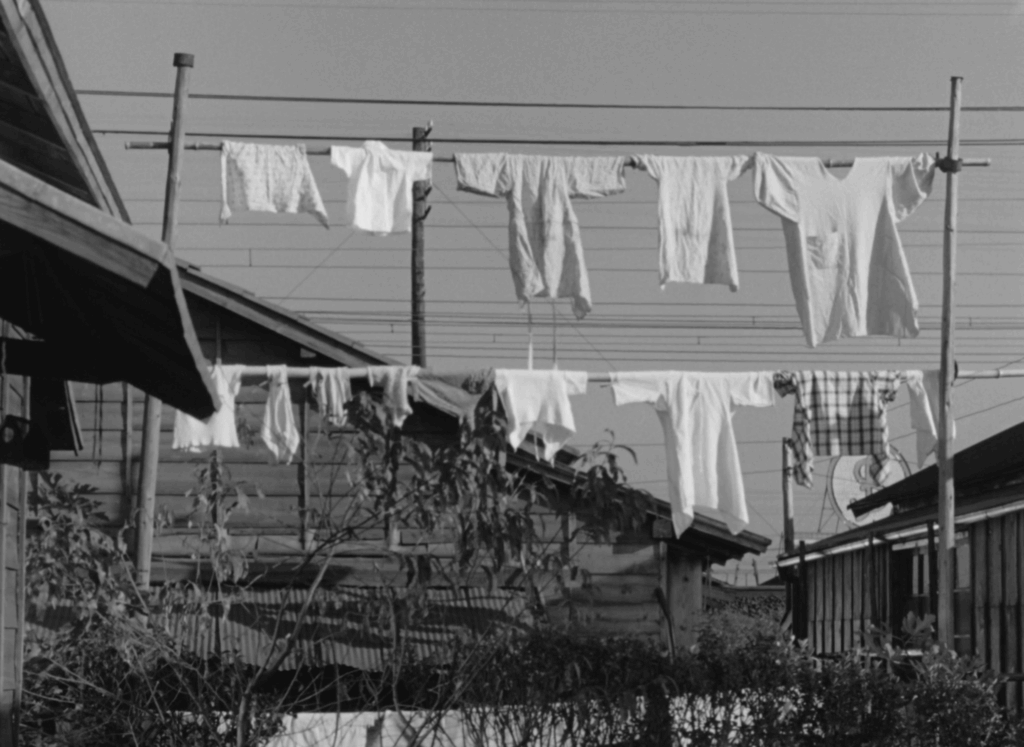 Ozu’s classic hanging laundry shot used in transitions – menial routines carry on amid marital turmoil.