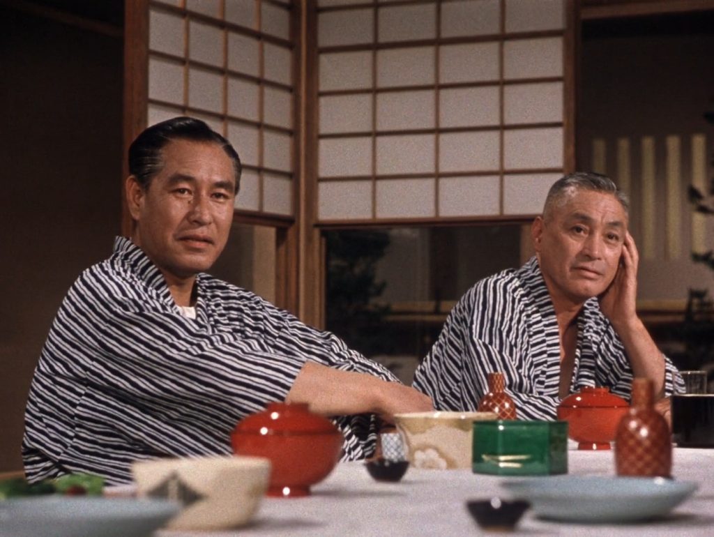 True to Ozu’s elliptical storytelling, Equinox Flower dwells more on life as it unfolds between defining events than the milestones themselves. In place of Setsuko’s wedding, we instead attend a small reception between Hirayama’s friends after the ceremony, where he learns from Mikami that he too has accepted his daughter’s choices. Red, green, and blue crockery decorates the table where they gather, and lines the bottom of the frame in mid-shots as Mikami sings a farewell poem based on the works of a fourteenth-century samurai.