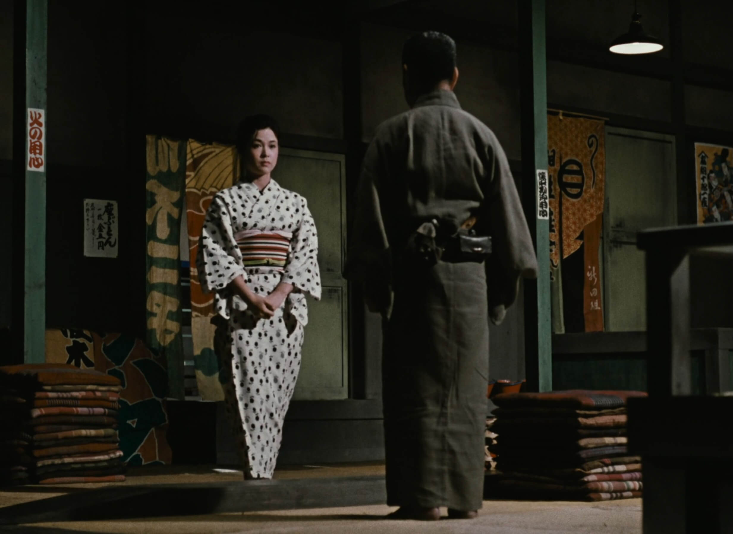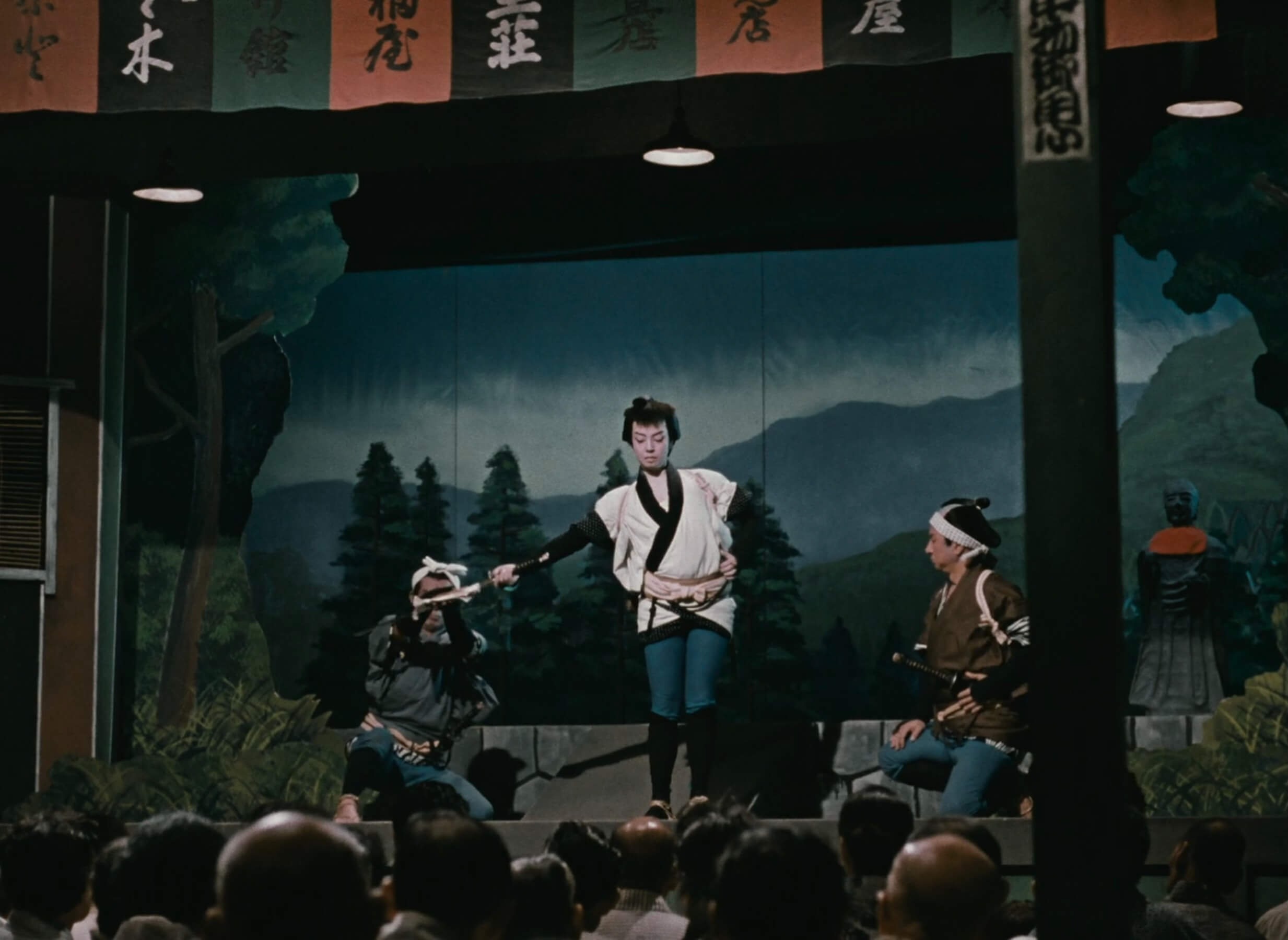 Much like Komajuro’s actors, we can see the end of the troupe coming from a distance. As work grinds to a halt, the time comes for them all to split up, beginning with supporting player Kichi who runs off with his fellow performers’ money and belongings. Gathering in the dim, green interior of the local theatre, it becomes woefully apparent that everyone has already made plans to find employment elsewhere – and just like that, this tenuous thread in the fraying tapestry of Japan’s theatrical tradition fully unravels.