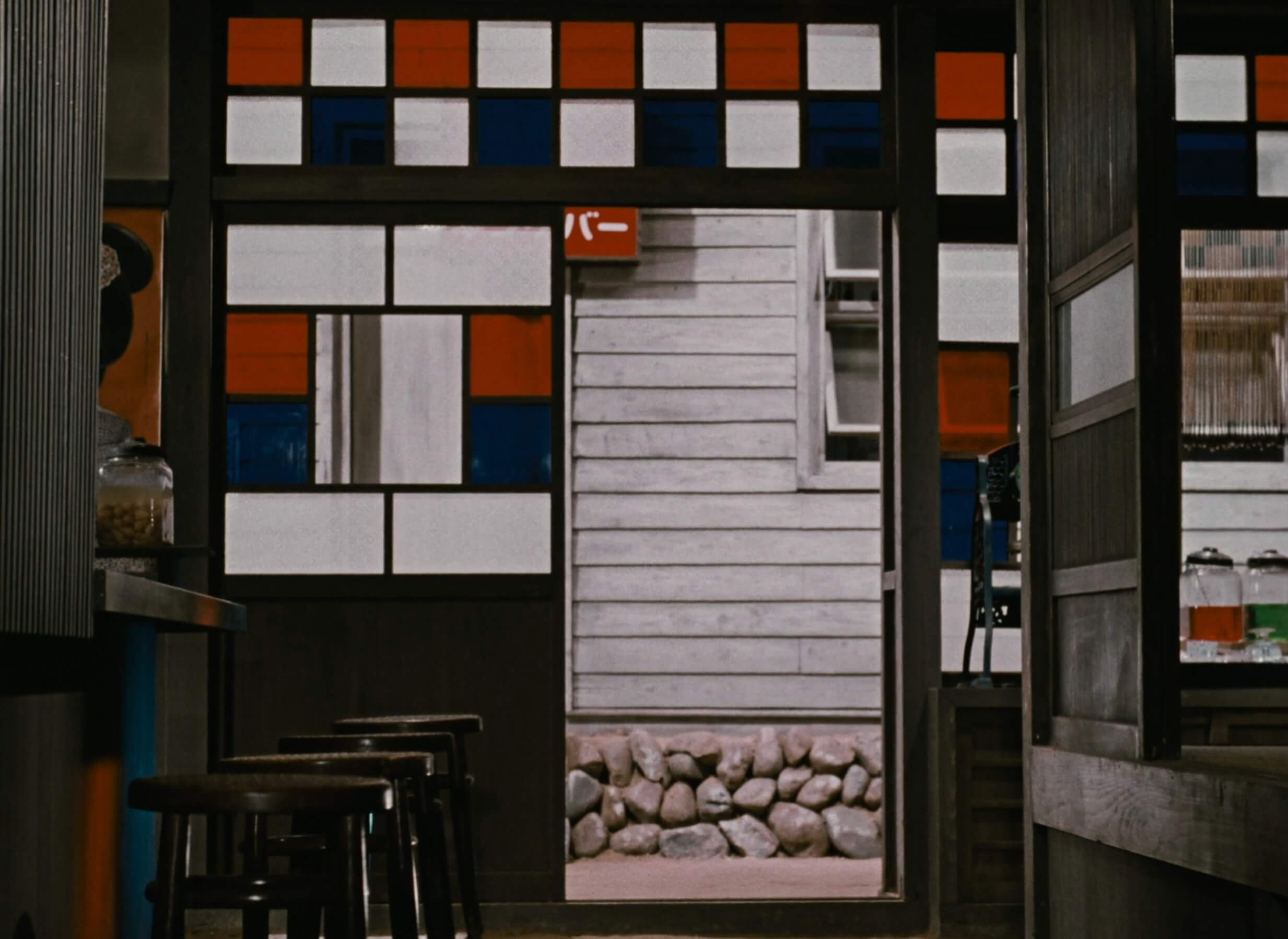 Formally as well, the time was ripe in 1959 to reinvigorate this silent, black-and-white film with Technicolor vibrance, revelling in the decorative details that bring life to this modest coastal village. Crimson flowers and drapes burst against the cooler tones of Ozu’s mise-en-scene, while stained glass windows colourfully arrange a grid-like pattern in the local sake bar. At the town’s outmost peninsula too, a white lighthouse becomes the focal point of many minimalist compositions, vertically mirroring foregrounded bottles or fishermen, and rising into a pale sky – “blue as a tragedy,” as one character puts it. For the residents, this building is just another unremarkable piece of infrastructure, yet to Ozu it is a beacon that recurringly anchors us within the landscape of daily life.
