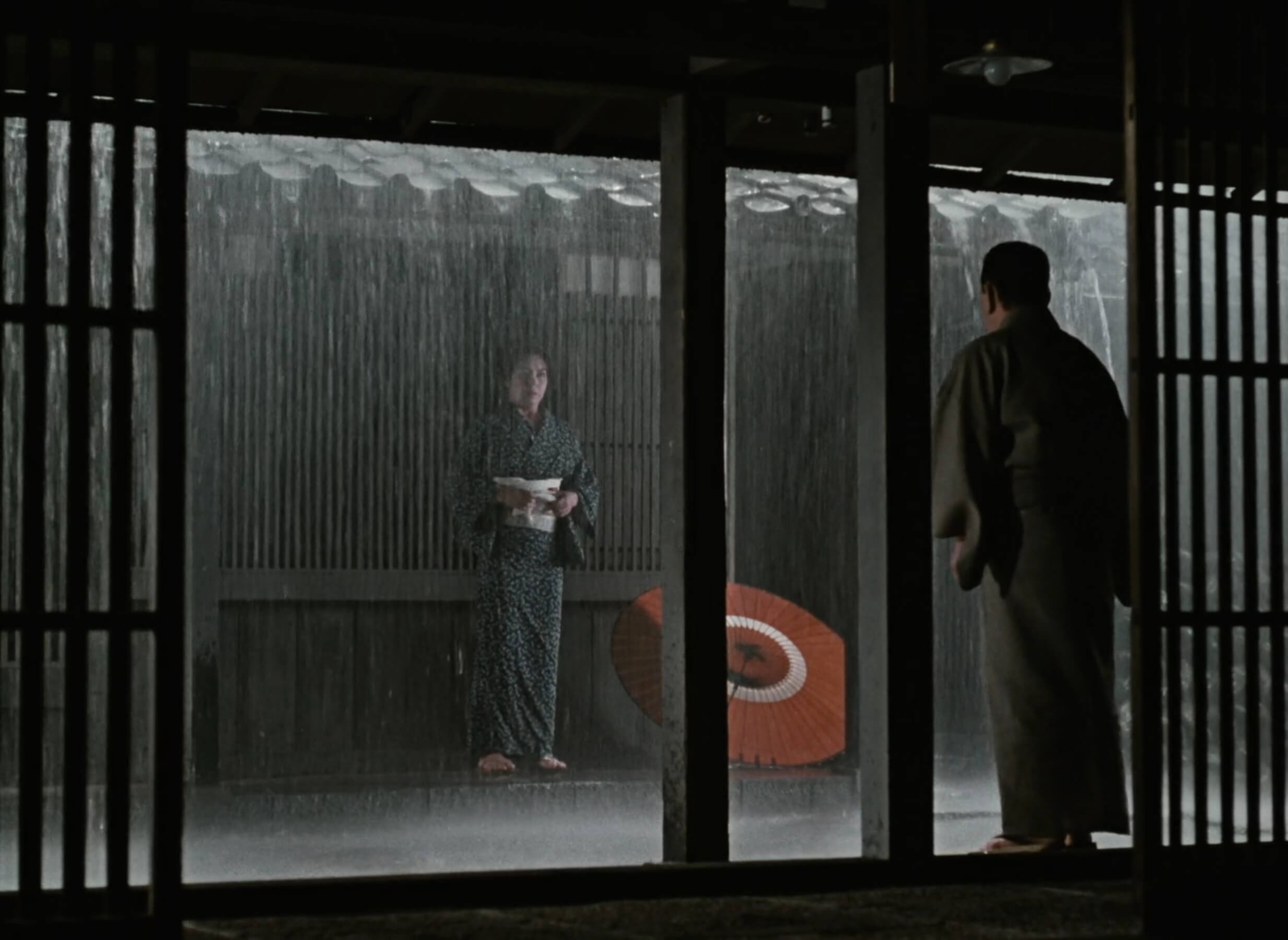 When Kiyoshi and Otaka also decide to make a brief, unannounced getaway, Komajuro is left truly defeated. “Please, tell him the whole truth,” Kiyoshi’s mother implores, inviting the possibility of a life where they can all live peacefully together. Nevertheless, any hope for harmony is rapidly dashed when the lovers return home and meet Komajuro’s violent, impulsive reaction. Defending himself from a beating, Kiyoshi pushes his father to the floor, and the low angle that follows renders him feeble indeed beneath the young man’s commanding stature. This is a world that no longer bends to Komajuro’s will, and even when Oyoshi finally reveals the true nature of their relationship, little can be done to mend the widening rift.