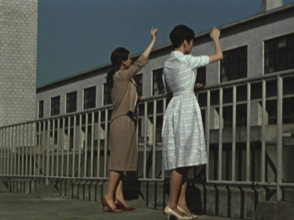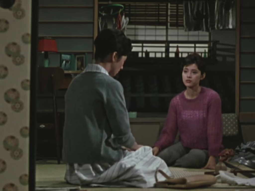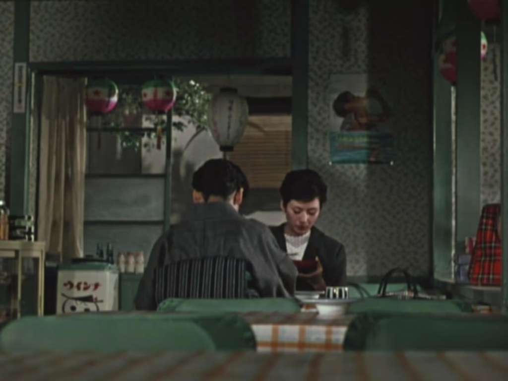 Even more notably, Ozu’s recent shift to colour filmmaking distinguishes Late Autumn’s vibrant visual palette, weaving organic green hues through office interiors, commercial signage, and mountainous pillow shots. This does not automatically render it a superior film to the black-and-white minimalism of Late Spring, but its vibrancy is nonetheless infused with a strong undertone of growth and renewal, often offset by bursts of contrasting hues. Right in the very first shot, the red beams of Tokyo Tower are obscured by foliage from a low angle, while later the Westernised independence of Ayako’s friend Yuriko is loudly announced through her purple knit sweater. Overshadowed it may be compared to Ozu’s masterpieces of this period, but Late Autumn’s updated examination of shifting Japanese traditions still finds fresh emotional textures in its colour compositions.