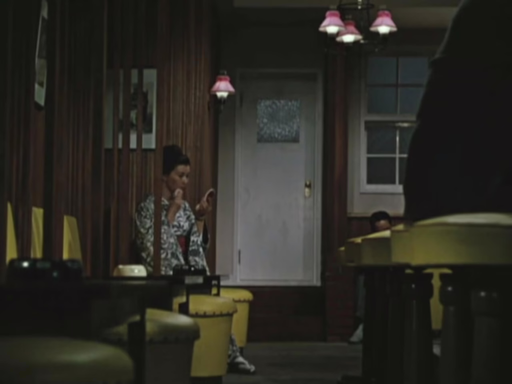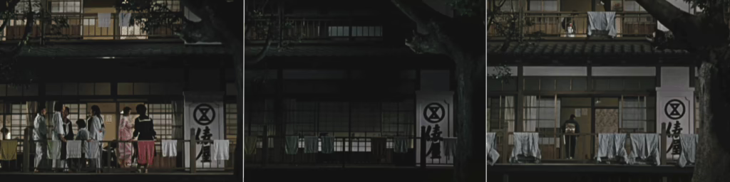 The story of their stay at the Tawaraya Inn is effectively captured in the three establishing shots set outside, the first of which reveals a bustling, lively nightlife. Inside, spirits are similarly high, right up until Akiko comes forward with the truth. “Your father was enough for me. He’ll always be by my side,” she explains to a shocked Ayako, revealing her decision to remain a widow. As her daughter breaks down in tears of guilt, Ozu returns to the exterior shot for second time, now dark and subdued with the settling night.