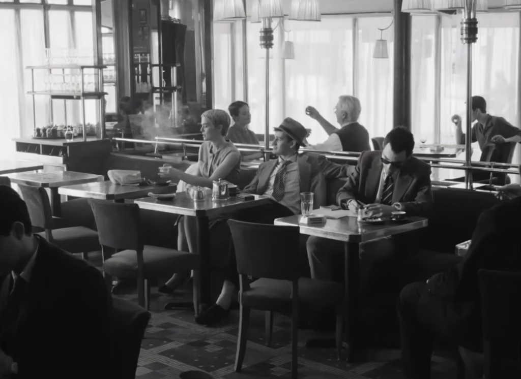 Indeed, Linklater’s appreciation for such freewheeling aspirations is evident in Nouvelle Vague, authentically emulating Breathless’ rough visual style through its grainy 35mm film stock, black-and-white cinematography, and cigarette burns. The location shooting is where this aesthetic truly flourishes though, trailing characters through the metro stations, parks, and cafés of Paris with handheld cameras, and vividly evoking the era in the gleaming vintage cars that line the Champs-Élysées. The name tags which introduce famous figures of the French New Wave against posed tableaux add a formal, self-aware touch too, nodding to everyone from Agnès Varda to Claude Chabrol, yet this is ultimately the extent of Linklater’s meta flourishes. As it is, the lack of any grand, formal experimentation in Nouvelle Vague leaves it far from the revolutionary energy of Breathless, with not so much as a jump cut to jolt the viewer out of narrative complacency.
