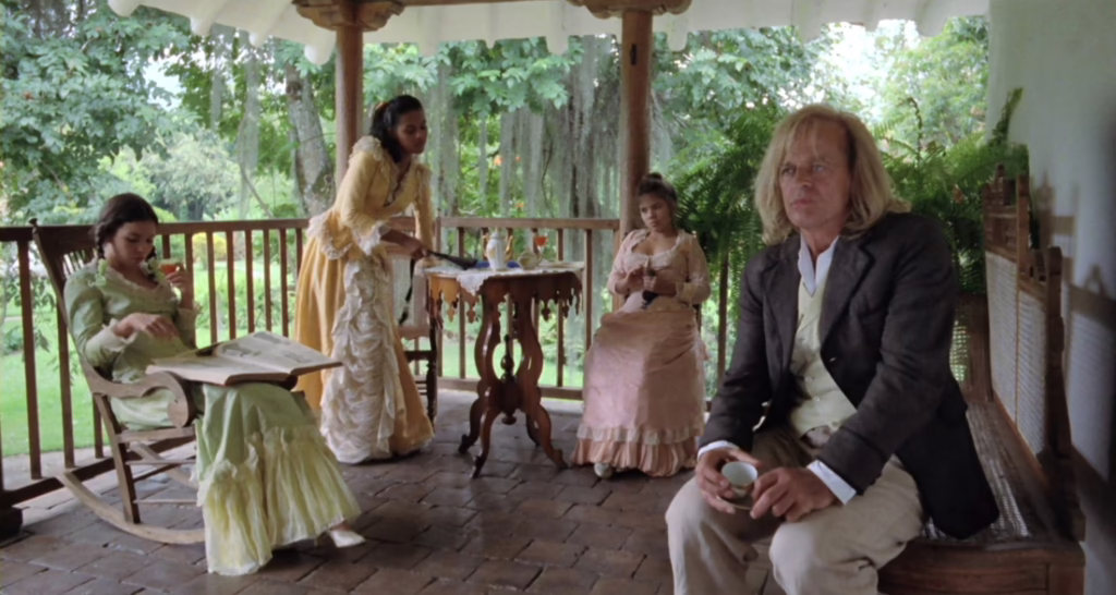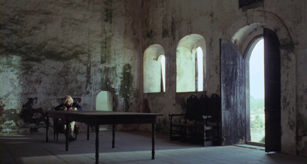Even with this feverish display of dominance, the slave trader, military leader, and now father of sixty-two children does not find satisfaction in his conquest. “I cannot begin to describe this cretinous existence of mine. Nor how lonely it is to be without family or friends,” he writes in his diary, pondering the hollow grandeur of his triumphs. As the camera tracks backwards from Francisco sitting at the end of a long table, the emptiness of this large stone hall is revealed, thoroughly isolating him in one of his rare moments of quiet, existential reflection.