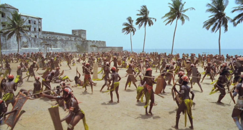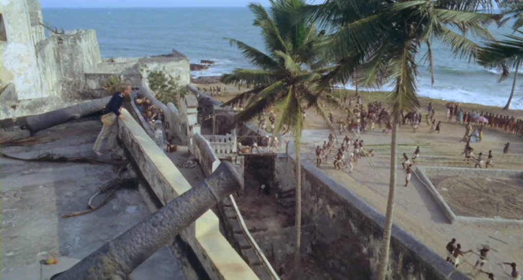 Where Herzog’s location shooting in the Amazon rainforest once amplified the madness of Aguirre, the Wrath of God and Fitzcarraldo, here it sprawls across Ghana, Brazil, and Colombia, traversing the scorched, blood-soaked terrains of colonial greed. The first shot which properly introduces these forbidding landscapes starts with an extreme close-up of Kinski’s miserable, droopy eyes, before zooming out to reveal him kneeling by his mother’s grave, and panning a full 360-degrees around an arid desert of cracked earth and calcified animal bones. Francisco’s origins are bleak, yet even after he crosses the ocean to the Kingdom of Dahomey, Herzog continues to sculpt natural visions of humanity’s ruin. There, Elmina Castle becomes Francisco’s dilapidated home, its decaying architecture perched on the Gold Coast’s rugged shoreline. This is not an environment which caters to foreigners, but with his stark pragmatism and dogged resourcefulness, the Brazilian bandit viciously bends hostile worlds to his will.