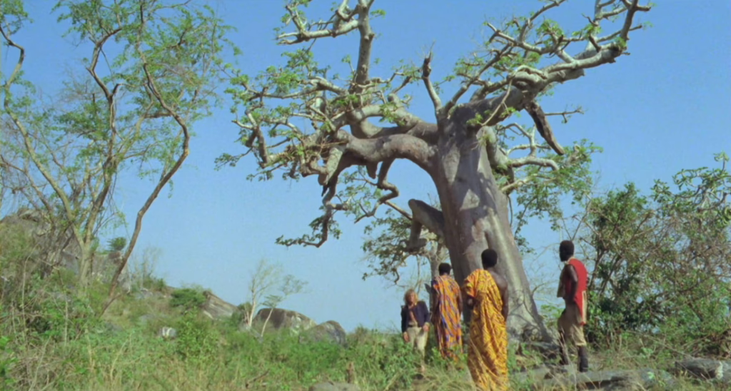 Of course, this is all a matter of perspective in Cobra Verde. Beyond its violent rituals of power, this culture he has invaded is a tapestry of vivid colours and communal rhythms, and one that he cannot fully inhabit. Bright palettes and bold, geometric patterns adorn its textiles, radiating liveliness in otherwise grim circumstances, while movement and music pulse through daily life. The dancing choir who joyfully perform to the camera is led by one girl in particular whose proud smile ignites the frame, and for some time, Herzog lets us linger in the hypnotic spectacle. Nevertheless, that vibrant harmony is eroded the moment Francisco awkwardly enters the shot, drifting among the topless women with a perverse, leering fixation. With his blonde hair like dry straw and pale blue eyes, he cuts a jarring contrast against the earth-toned bodies of those around him, constantly reminding us of his disruptive colonial presence.