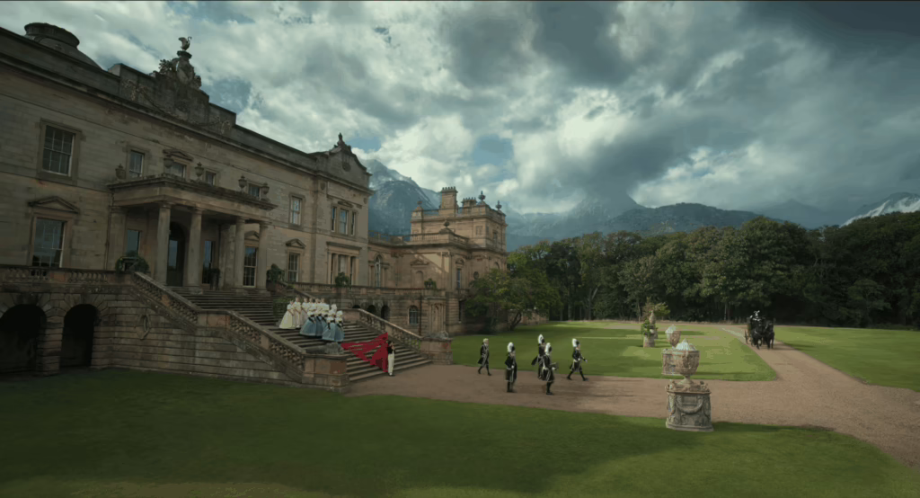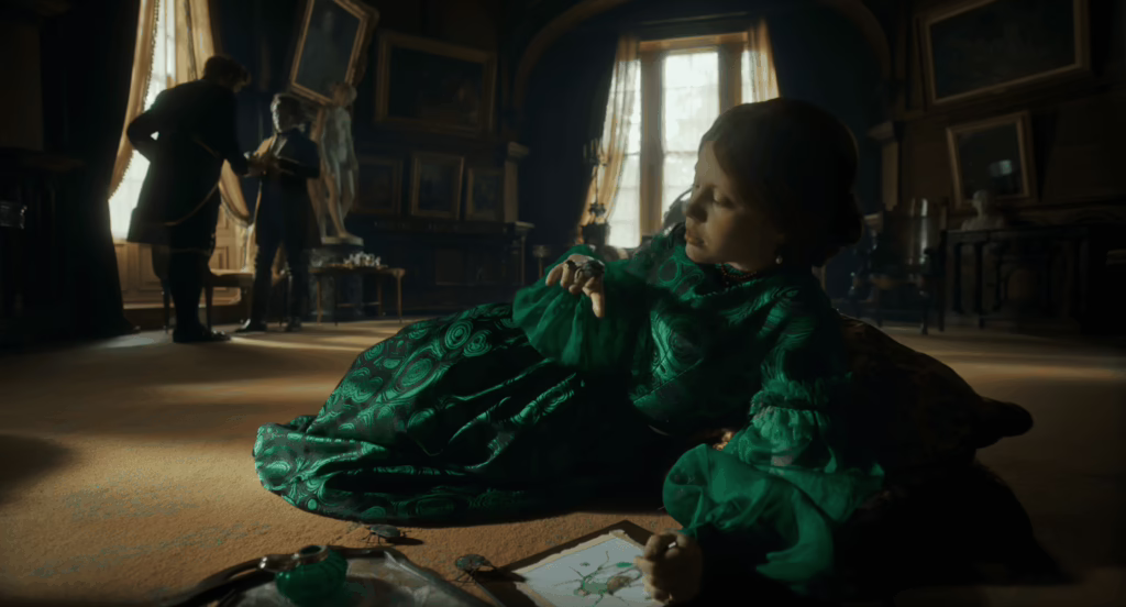 The colour palette that del Toro draws between the two female anchors in Victor’s life only intensifies this psychological tension too, cloaking his mother in an ethereal red veil, while Elizabeth is primarily costumed in ravishing green dresses. Even beyond her stylish wardrobe, del Toro weaves these vibrant hues all through his elaborate mise-en-scène, pitting the aggressive quest for immortality against the fragile sanctity of life itself. Wreathed in flames and promising Victor dominion over mortality, nightmarish visions of a scarlet angel further enrich his chromatic symbolism, eerily channelling the ‘Angel of Destruction’ from Shelley’s primary inspiration, ‘Paradise Lost’. The dichotomy of ruin and redemption tugs at the soul of del Toro’s Frankenstein, and through his vibrant, Gothic splendour, imbues it with a mythic weight that entirely dwarfs its lonely characters.