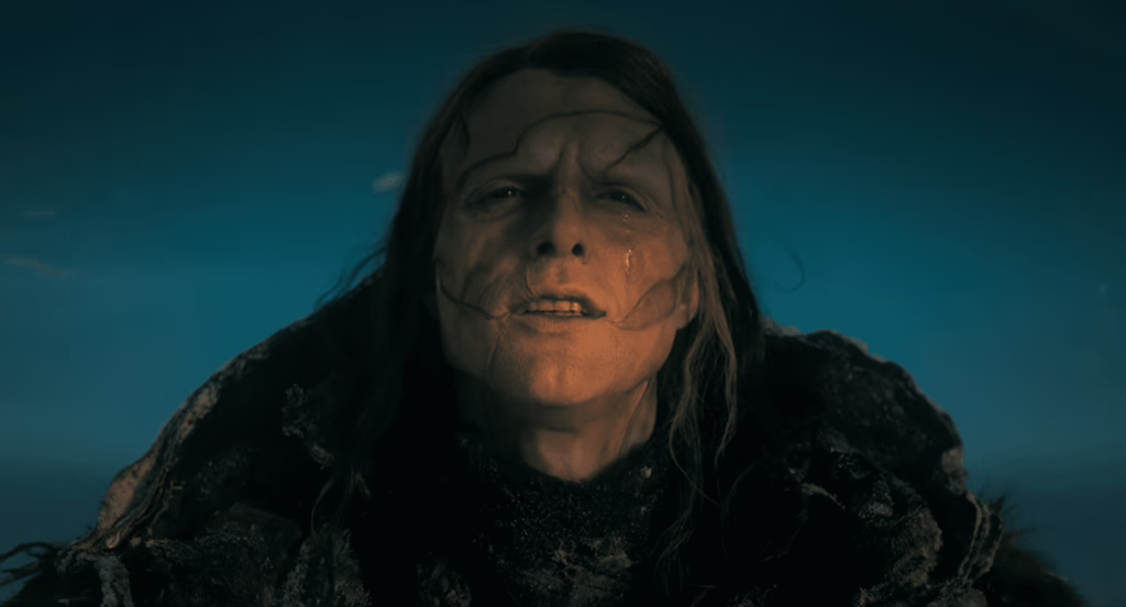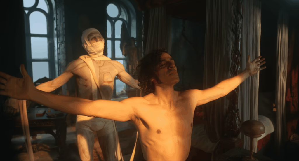 Far from the hulking, moaning brute that was Boris Karloff’s portrayal of the Creature, Jacob Elordi’s is a pale, sinewy patchwork of parts, clumsily stumbling through a hostile world with a raw, primal vulnerability. Though he has already made an impressive step outside of teen rom-coms and into more demanding dramatic territory, Frankenstein cements his evolution as an actor of haunting depth, depicting the full life cycle of this tragic outcast from his trembling infancy to his inevitable loss of innocence. He is quick to learn the cutthroat hostility of a world that preys on weakness, finding its only glimmer of kindness in a blind, elderly man who cannot see his misshapen form. Elordi’s voice emerges in a deep, resonant stutter as this unlikely father figure teaches him to speak, and eventually breaks into a guttural roar when the man’s family inevitably discovers and attacks him.