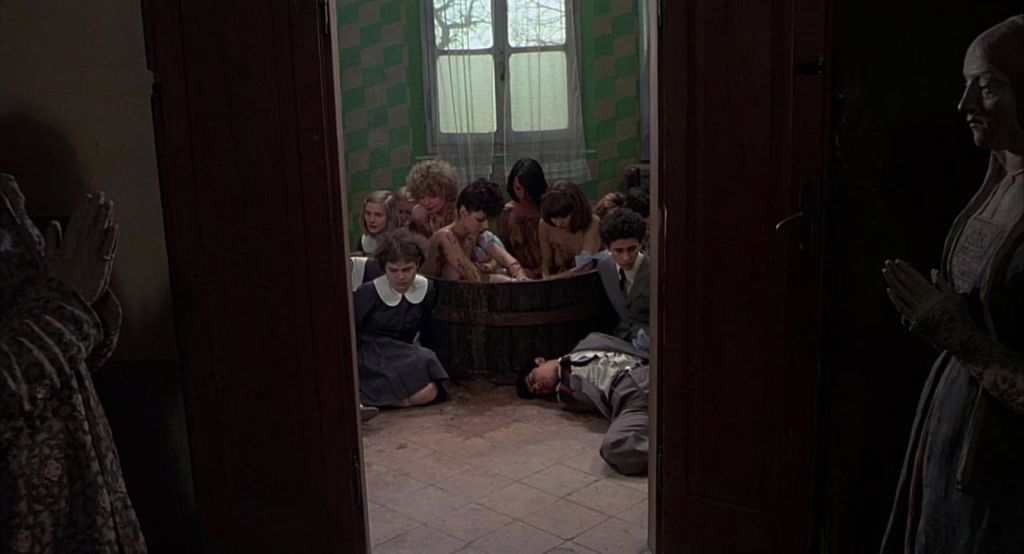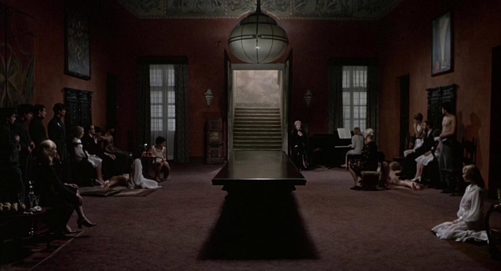 Of course, Pasolini’s transgressive achievement would not be nearly as towering were it not for his painstakingly crafted compositions, often mimicking Renaissance paintings in their symmetrical tableaux, linear perspective, and geometric architecture. Likewise, Art Deco and Bauhaus-inspired styles lend these regal halls of power a cold modernity, specifically anchoring Salò’s setting to the recent history of World War II and casting the horrors of fascism in a disturbingly familiar frame.