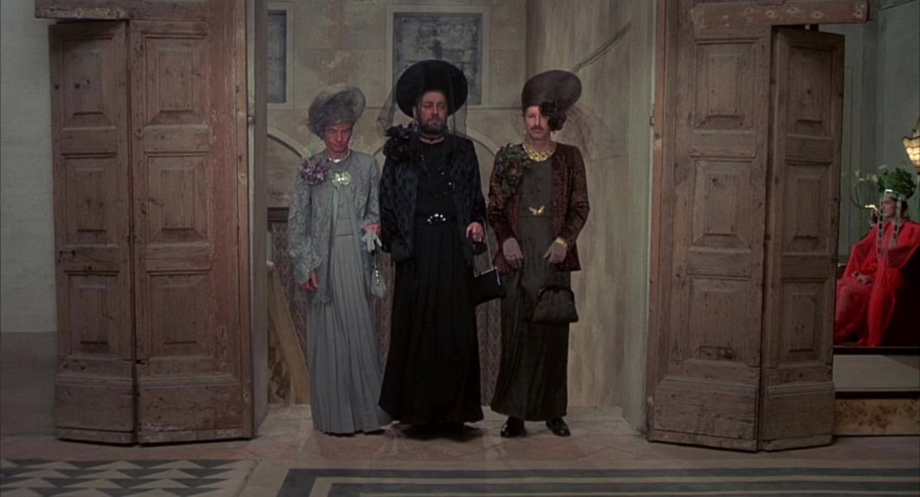 By further desecrating the holy institution of marriage too, these fascists essentially lock the adolescents in a conjugal prison, performing mock weddings to pervert this traditional rite of passage into a shattering loss of innocence. Pasolini continues to approach his staging with aesthetic rigidity here, particularly when the libertines themselves decide to marry their studs in a blasphemous parody of matrimony – the Duke, Magistrate, and President garbed in drag, while the Bishop conducts the ceremony in searing red robes. Within the otherwise colourless hall, these aggressive tones pierce the grim proceedings, drawing our eye to the farce of power dressed in sacred vestments.