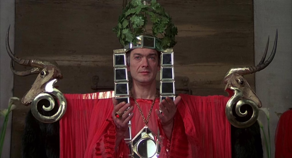 The ritualised cruelty of the libertine’s domain is senseless, yet it serves a pointed purpose in Pasolini’s portrait of an aestheticised, autocratic regime, sustaining violence through repetition and control.