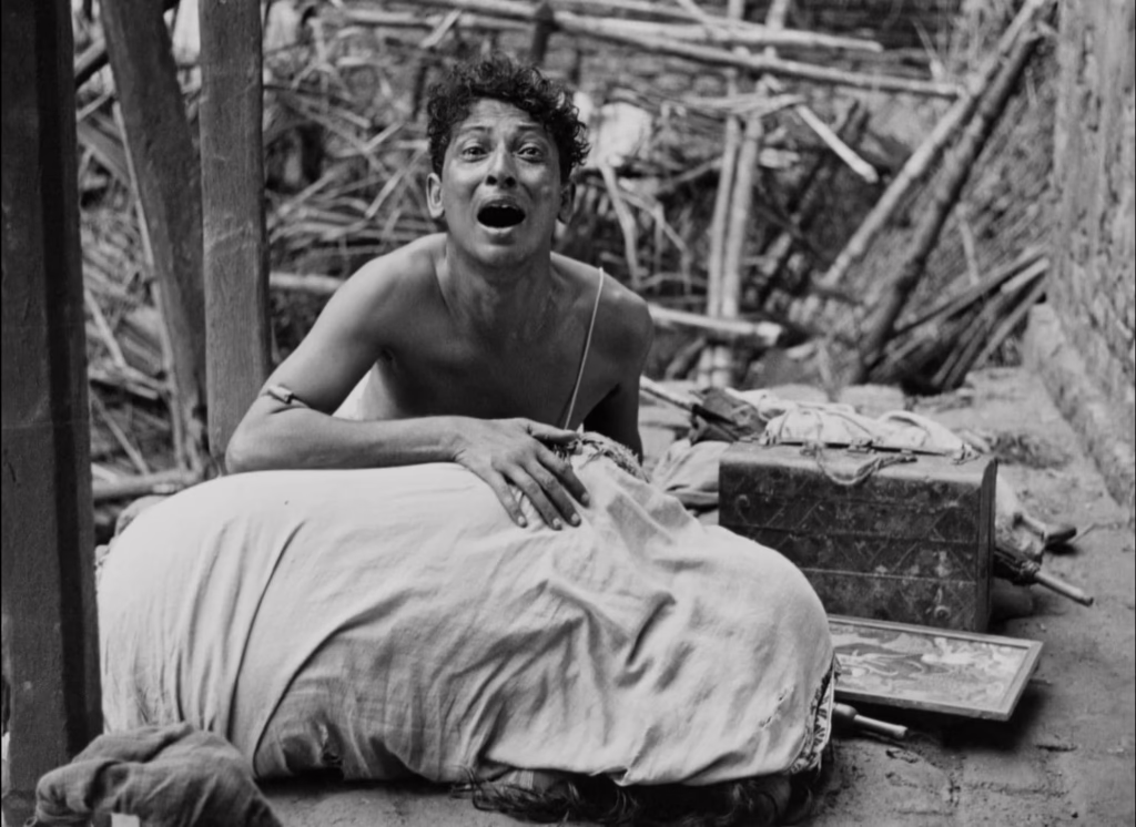 The storm does not let up throughout the following morning either when Durga falls sick, having caught a nasty cold. There is little that Sarbajaya can do to keep the harsh, outside world from penetrating the house as she cradles her daughter, its bitter winds extinguishing oil lamps, blowing open doors, and rocking a small icon of Ganesh. This is Ray’s most aggressive montage yet, though it is in the still, ruinous aftermath that we particularly feel its mournful impact. Drifting over the sodden debris and murky puddles, the camera eventually finds Sarbajaya holds Durga’s lifeless body, her eyes hollow with a grief too deep for tears.