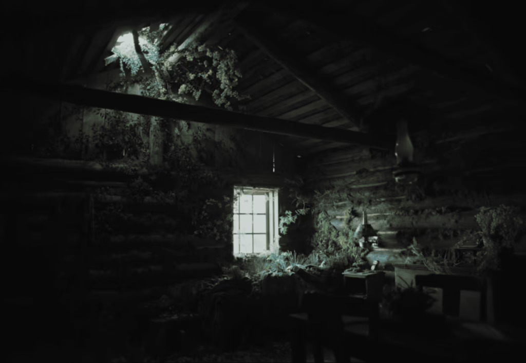 Perhaps this longing for order in the face of inevitable decay is why Bentley imbues his compositions with such meticulous rigour, often blocking workers like subjects in historical photographs, and distinctly departing from Malick’s free-flowing style. It isn’t unusual for Bentley to isolate them in the centre of his symmetrical frames as well, like artefacts of historical study, while the camera steadily zooms out through long, slow takes. Especially when we consider those recurring symbols of endurance which punctuate the film’s transience, Bentley crafts some magnificent visual tableaux, most notably in the old pair of boots nailed to a tree as an eternal memorial to loggers who were killed on the job. They may grow weathered with the passing years and weeds may creep through their seams, yet each time Grainier recalls them, they take on greater significance in their struggle against time and decay.