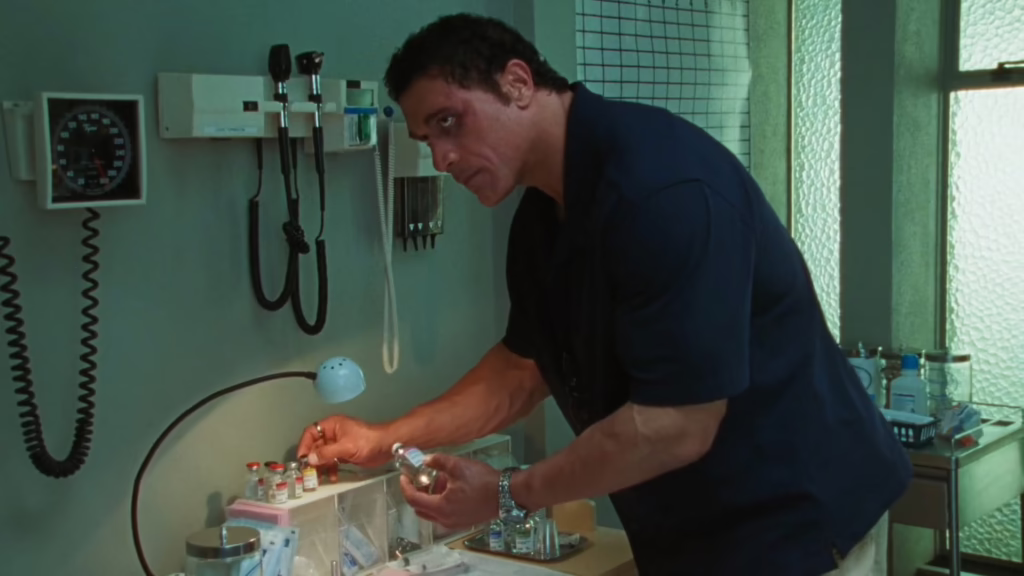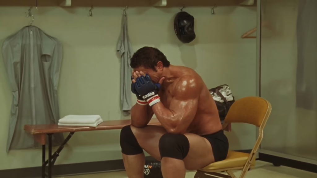 The marital arguments between these two bear long stretches of The Smashing Machine, erupting over common points of tension including Kerr’s dependence on painkillers, his reluctance to be a father, and his preference to travel overseas alone. The repetition becomes tiresome at points, yet every so often Safdie jolts us with the destructive ramifications of their conflicts, resulting in broken furniture, overdoses, and suicide attempts. Instability defines this relationship, and the further we trace Kerry’s drive to conquer his physical limitations through self-administered drugs, the more we recognise that his own fragility fuels both both his aggression and ambition.