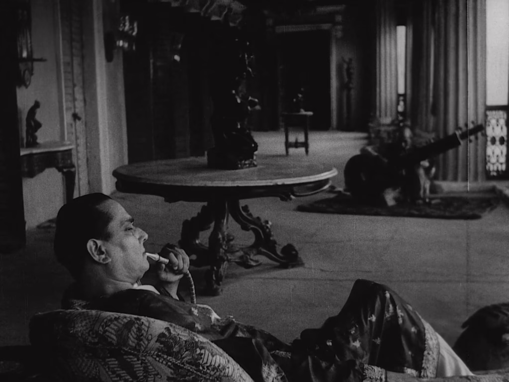 Although The Music Room marked a notable shift from the rural austerity of the Apu trilogy, Ray’s restrained naturalism firmly remains, countering the spectacle of Bollywood with a far more critical vision of India’s entrenched class divisions. Biswambhar’s hubris stems from the belief that his “noble blood” is intrinsically superior to the blood of those like his neighbour Mahim who earned their wealth rather than inheriting it, and Ray spares no expense in dismantling this lofty ego. Where his contemporary Guru Dutt uses stylish camera movements to sweep us away in musical spectacle, The Music Room’s tracking shots are entirely confined within this historic palace, sitting by a broad river amid a vast, dusty plain. Here, crane shots descend past that extraordinary chandelier and surrounding columns toward the floor, and elsewhere dollying in on actor Chhabi Biswas’ proud, jealous, and mournful expressions as he lounges around, soaking in the stuffy decadence.