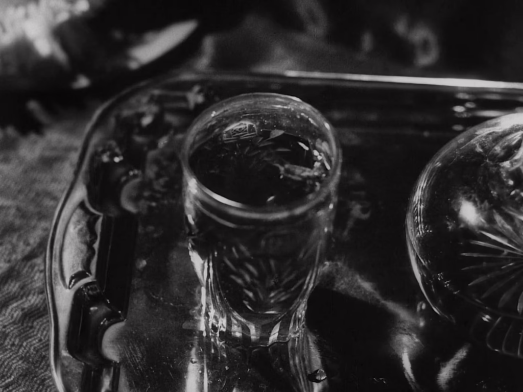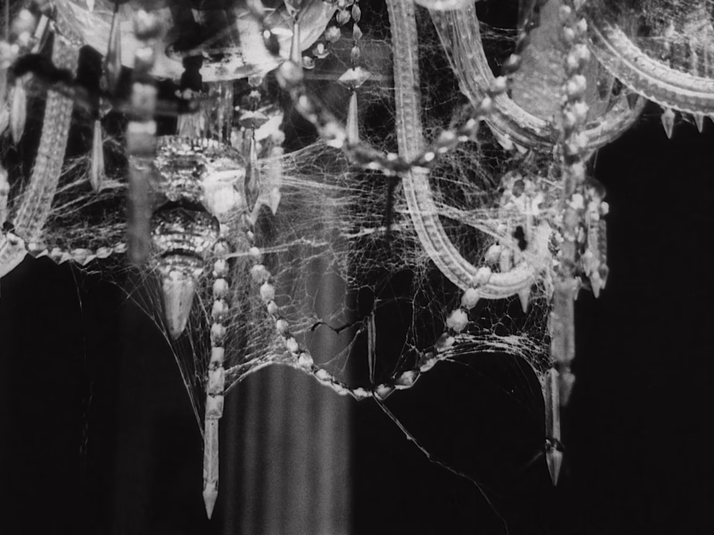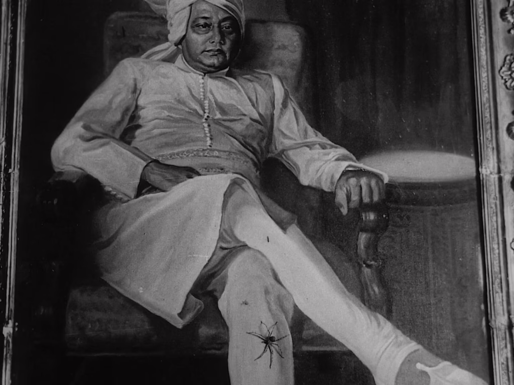Inferior blood is why Miham failed, he asserts, and why he himself should emerge as the victor of their petty contest. “To you, my noble self,” he narcissistically toasts to his portrait once the crowd has gone, before pausing in disconcerted angst. There, on his painted leg, a spider has uneasily settled – not quite enough to quell his intoxicated pride, yet also only the first omen to signal his pending downfall. In the reflection of his wine, Ray gorgeously catches the shining reflection of the chandelier overhead, its flames flickering and dying one by one. Darkness has returned to the music room, and in this elegiac metaphor, Biswambhar is harshly reminded that no glory is so luminous as to burn bright forever.