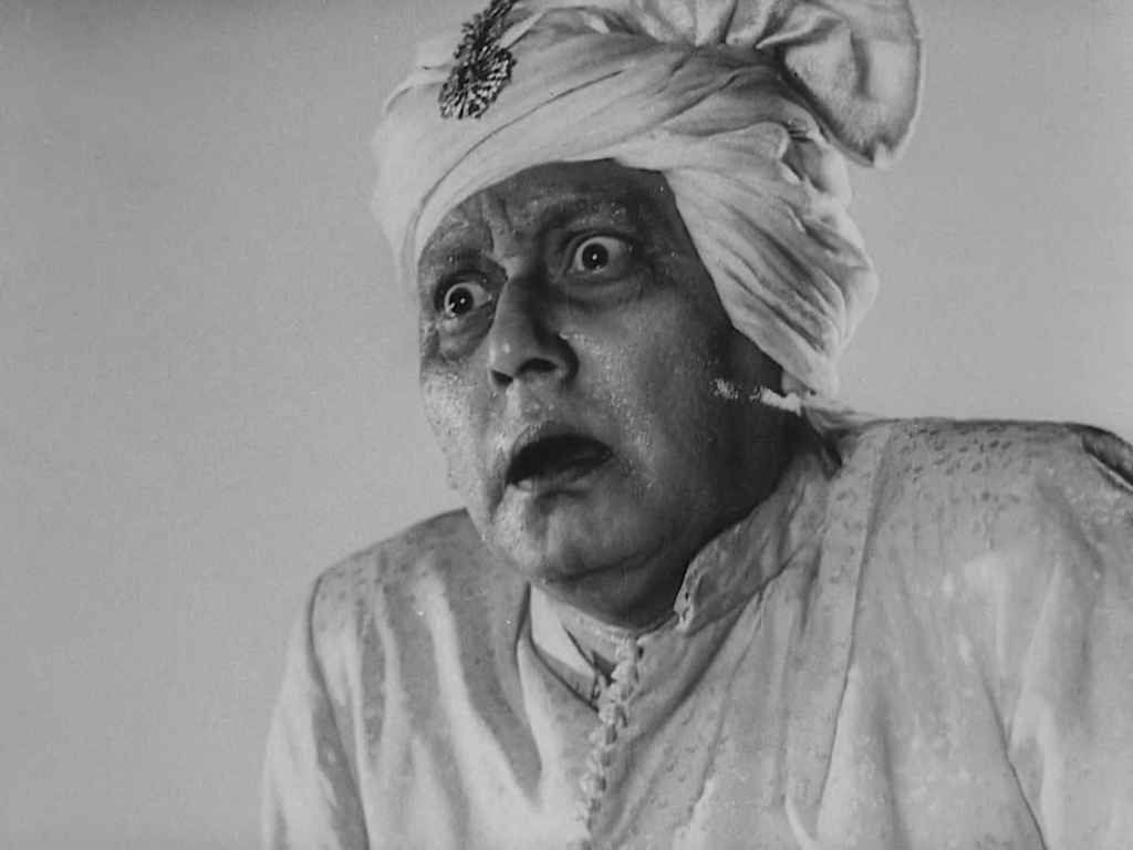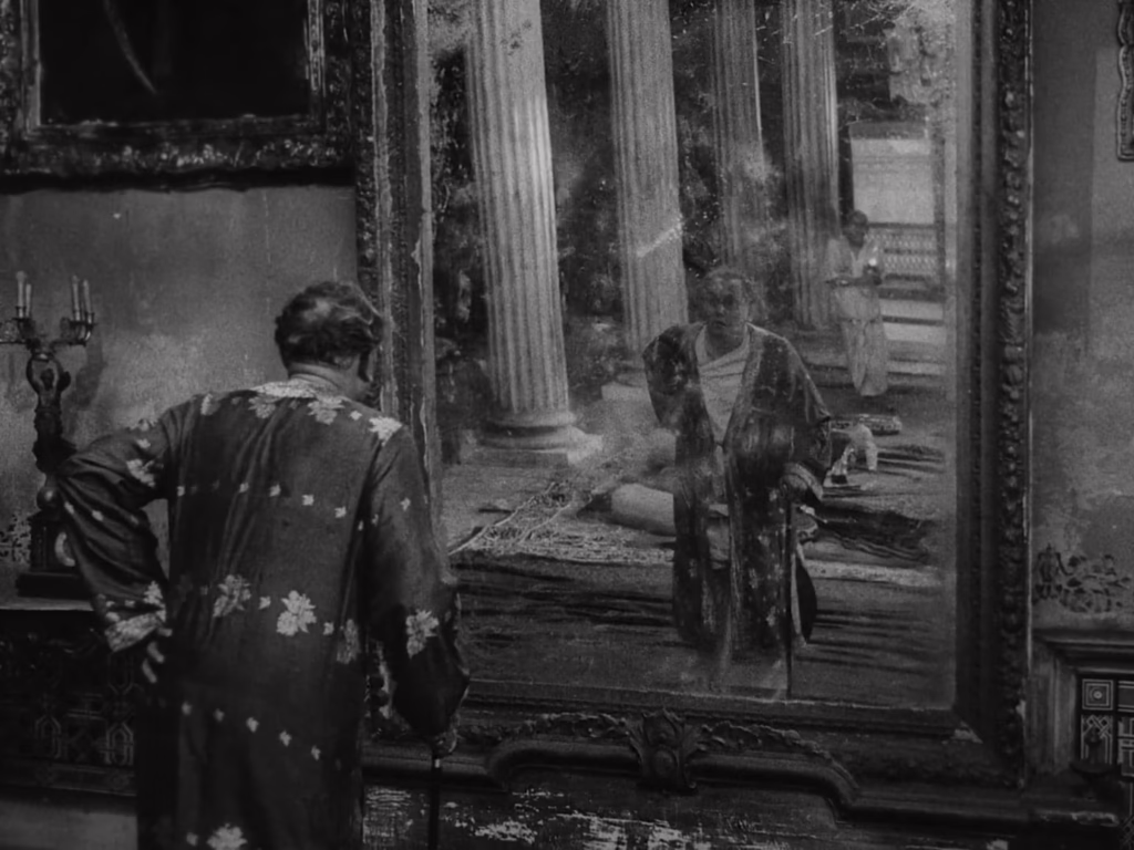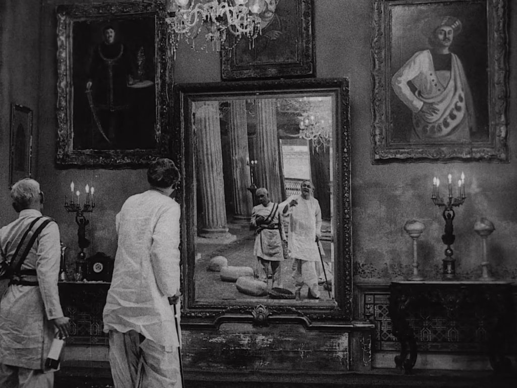 The first performance that graces Biswambhar’s music room is a thumri – a genre of delicate ornamentations and subtle improvisations typically sung by a woman, sensually expressing love and longing. Mortgaging his family’s valuables to have these musicians perform at his son’s initiation ceremony is a trivial sacrifice to him. The event is a resounding success, showing off his extraordinary affluence and cultivated musical taste. Visually too, Ray also uses this scene as an opportunity to fully bask in the music room’s tremendous set design, with luxurious furniture, ancestral portraits, and oversized mirrors reflecting Biswambhar’s inflated self-image. Beneath that glittering chandelier, servants wave giant fans over the audience, while the camera smoothly drifts through the space – before settling on Mahim, who we find picking his nose. Clearly, the social divide between these neighbours is irreconcilable.