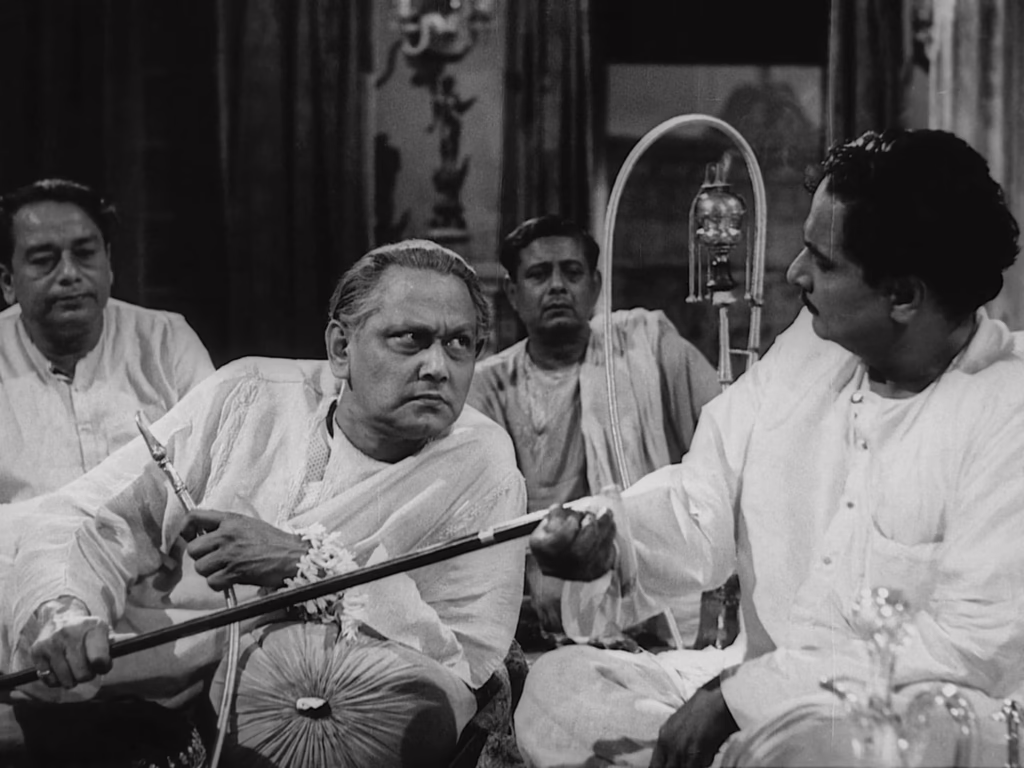 “No more music for me,” Biswambhar laments from his darkened sitting room, broken both financially and emotionally. There ends the first half of Ray’s story, which then leaps four years forward to find Biswambhar aged by time, grief, and isolation. His debts have forced him to auction off much of his furniture, yet hardship has not humbled this tremendous ego. The music room is to reopen, he impulsively decides upon returning from that extended, dreamy flashback, and thus he goes about hiring the popular dancer from Lucknow who Mahim himself has commissioned.
